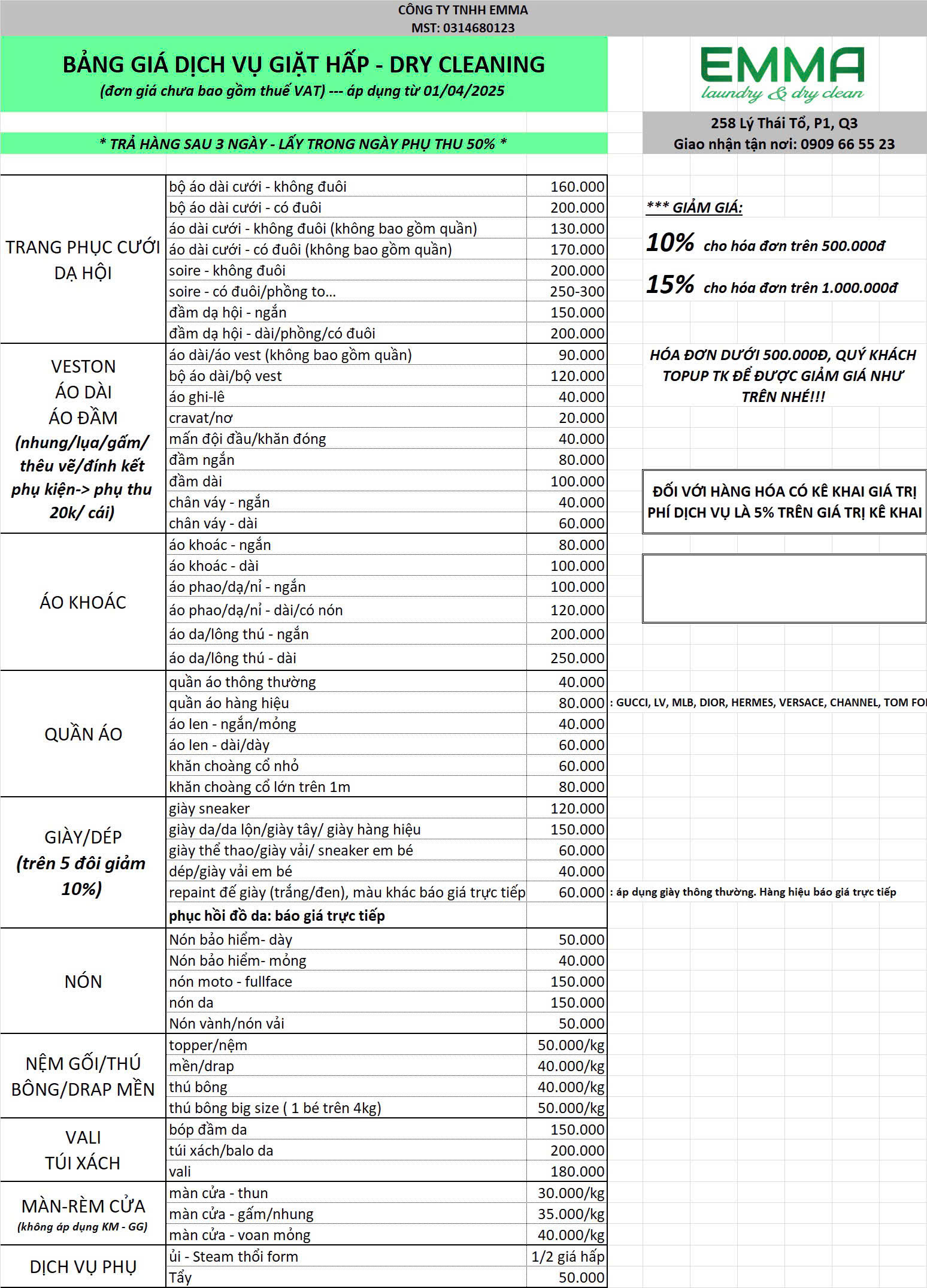 Emma đáp ứng mọi nhu cầu về giặt. Chuyên giặt ủi, giặt hấp cao cấp các loại các loại quần áo hàng hiệu, trang phục sự kiện, dạ hội, thú bông, topper...