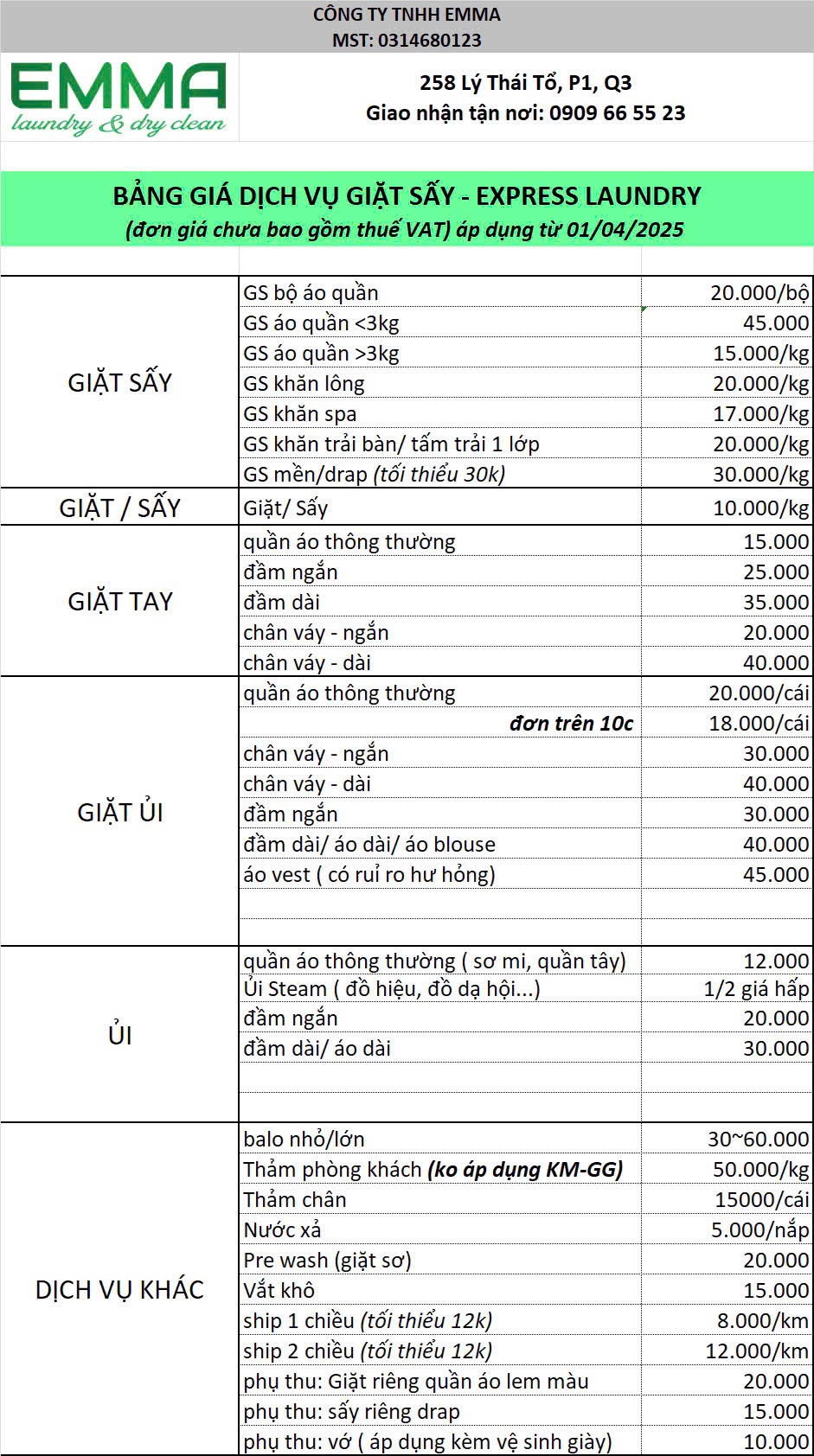 (Đơn giá chưa bao gồm thuế VAT) - áp dụng từ 01/04/2025)